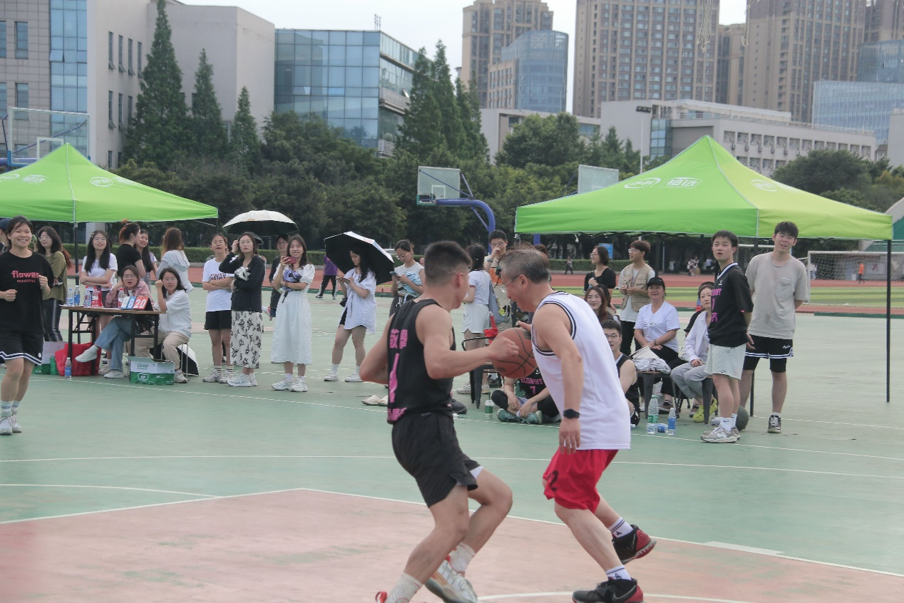 比赛中,比分交替增长,局势紧张刺激、跌宕起伏。在场观看的同学们不断为师生精彩进球欢呼、鼓掌。“漂亮!吴院长投进了一个3分球!”谢欣然同学激动地说到。