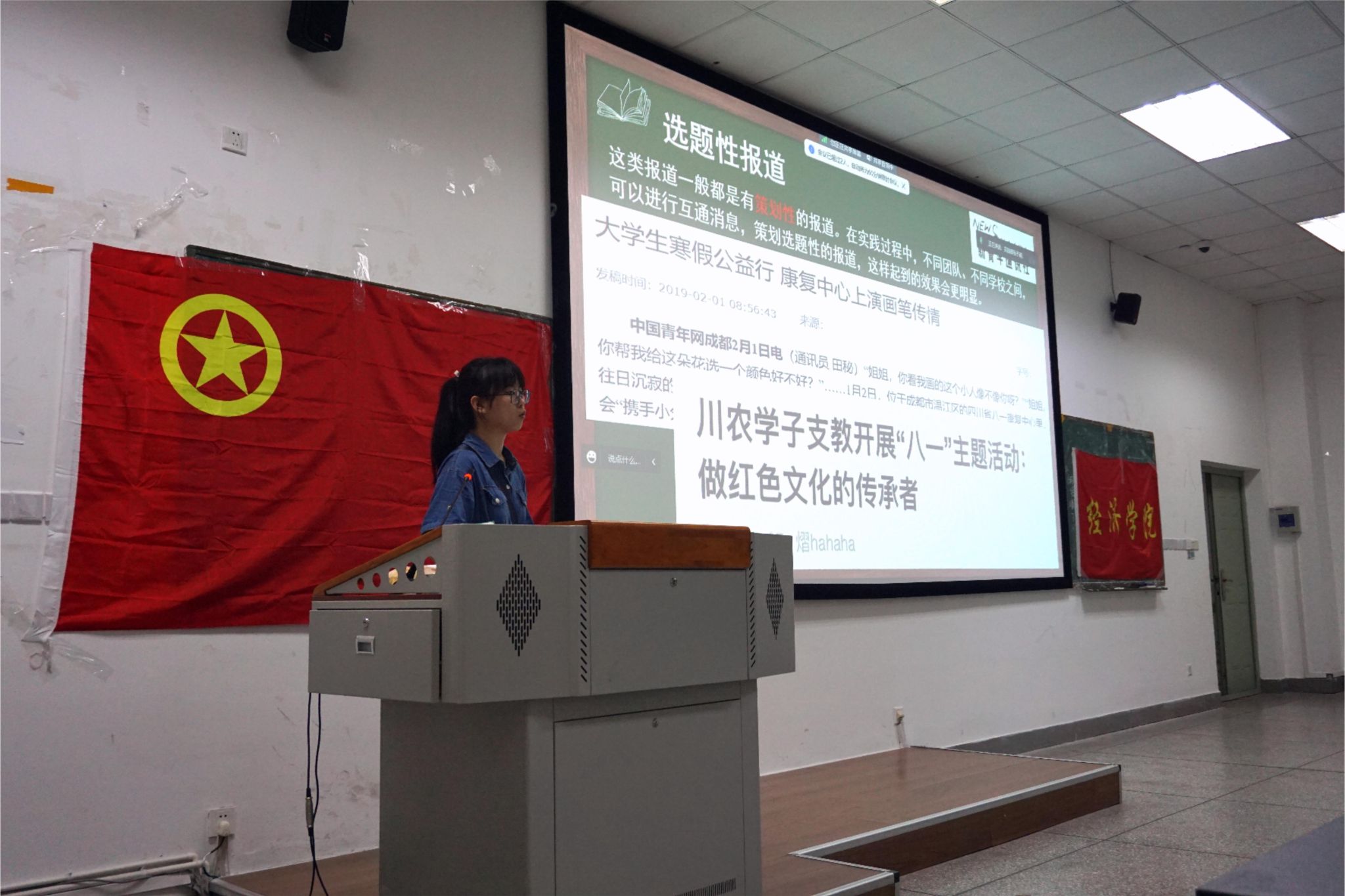 新青年通讯社采编部闫沥心在永利集团88304官网在线登录2023年暑期社会实践出征暨授旗仪式向大家讲解了社会实践新闻稿写作与一般新闻稿的区别,强调各类社会实践活动新闻稿攥写的差别。此外,她还列举了一些官方新闻稿平台投递渠道,以及同学们写作新闻稿时经常出现的问题,帮助学院同学更好地开展社会实践活动。