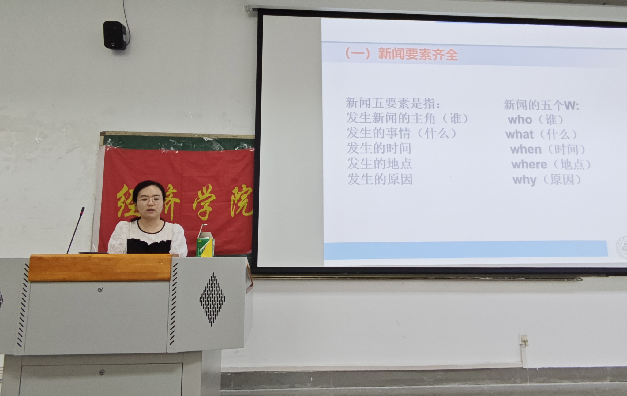 张喆老师围绕素材搜集、写作要点及图片拍摄三方面作了新闻写作要点的细致讲解,结合典型新闻实例,向大家阐释了新闻稿所必须具备的五要素——何时、何地、何人、何事、何故,强调了新闻稿的生动性、时效性、真实性和客观性。