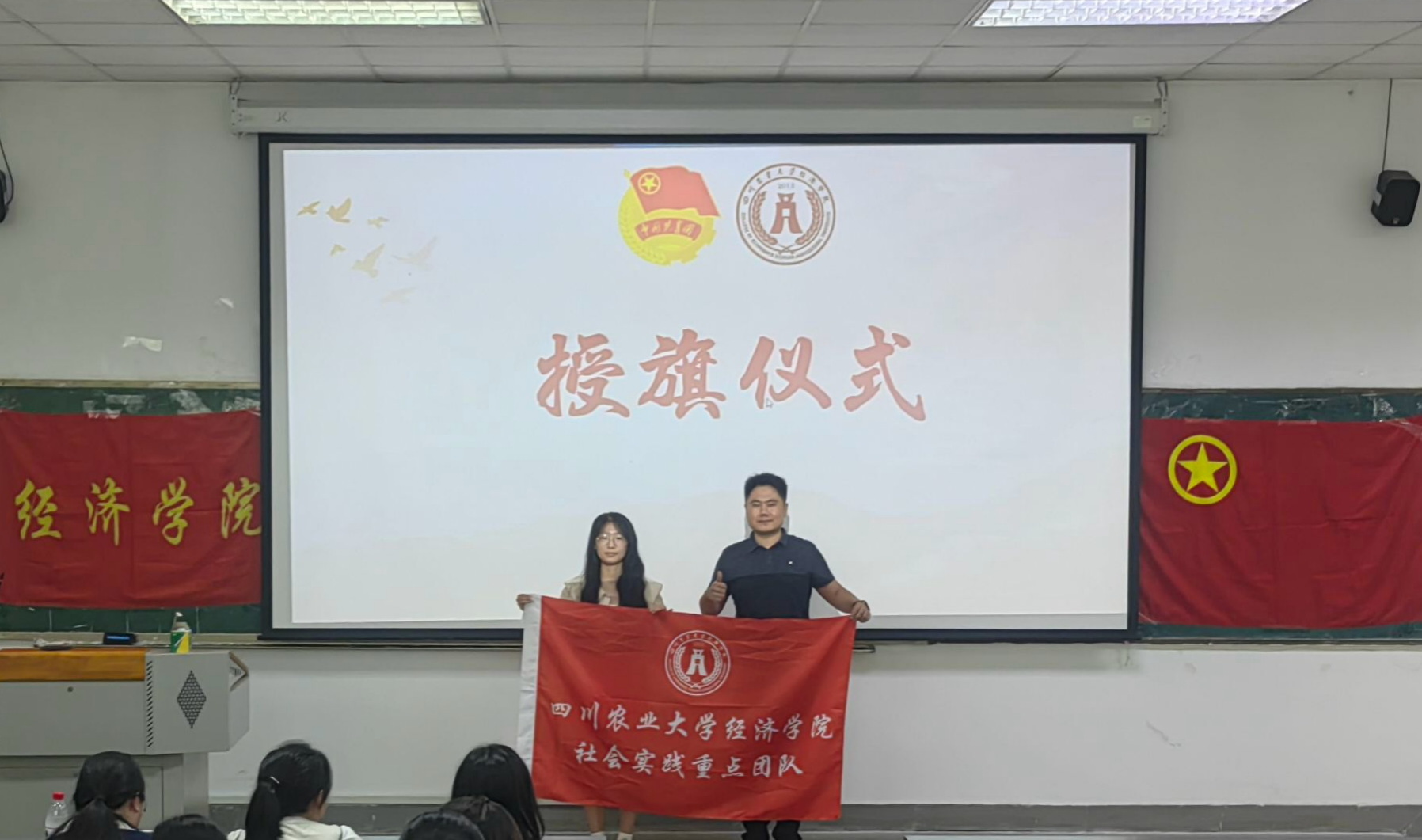 武方琨老师分享了近期实践调研的安全风险案例,强调在气候多变的夏季要关注天气变化,防范自然风险,提醒同学们要时刻保持警惕,确保人身和财物安全。并在随后出征仪式上,为学院暑期社会实践团队队长代表授旗。