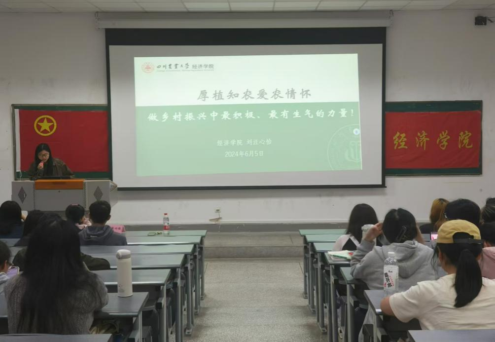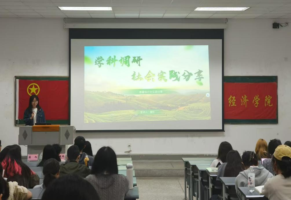 刘汪心怡从团队概况、调研历程、成果展示、实践经验四个方面,详细介绍团队如何围绕“服务乡村”这一主题开展实践并推动产业绿色转型和民生福祉改进。她强调,数据收集与分析在形成优秀调研报告中具有关键作用,并以“敢做敢为,善做善成”的精神鼓励同学们积极参与社会实践,让同学们对学科调研有了更具体的认识。