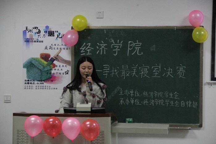 进入决赛的8个寝室分别就寝室的成员介绍、创意装饰、文化建设等方面进行了精彩解说。4-2-303寝室是一个由各色学霸组成的寝室,“爱学习、爱生活”是他们的标志和特色;2-1-217寝室则是一个有情调的寝室,他们分享了“床上小衣柜”,“自制鞋子收纳架”等小妙招,生活气息十足; 2-1-218寝室的成员多才多艺,现场表演了吉他合唱演奏,从唱歌到跳舞,从吉他到古筝,丰富的才艺令人接连惊叹。8个寝室纷纷拿出看家本领,向在场的嘉宾及同学展示了经济学子的魅力与风采,赢得了在场同学的阵阵掌声。