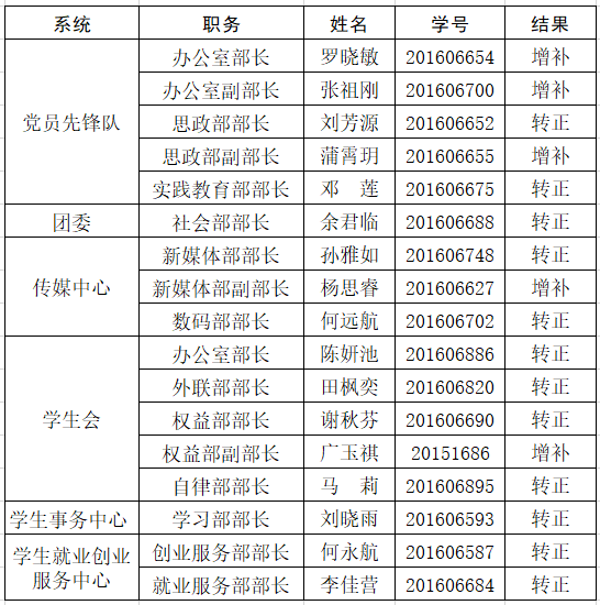 根据《永利集团88304官网在线登录关于加强学生干部队伍建设的实施办法》(院团字[2016]11号)文件精神,经民主测评、答辩、团委研究决定,确定永利集团88304官网在线登录第三届学生团体联合会中期增补、转正人员,现将名单公示如下: