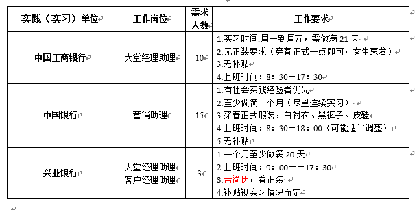 学院团委为培养学生的实践动手能力,促进学生在实践中运用知识,提升自身素质,增强就业能力,同时给更多有意愿参加实践(实习)的同学提供机会,将开展银行实践(实习)项目。具体事宜通知如下: