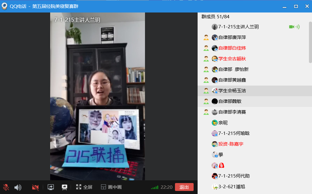 第五届美寝大赛决赛总成绩由下寝打分、微信投票、特色视频展示、线上答辩四板块构成。于下午进行的是线上答辩环节:此次答辩为“4+2分钟制”,即4分钟寝室展示时间和2分钟提问时间。随后评委依据寝室表现进行评分,去掉最高分,最低分,取得平均分。