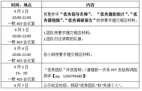 2.学院将于9月5日19:00在1教403会议室举行“优秀团队”评优答辩,参选评优团队制作答辩PPT,以陈述5分钟,提问3分钟的形式进行答辩。