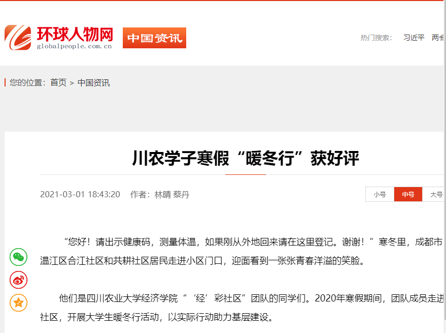 经过前期线上线下多种渠道的大力动员,经院学子寒假社会实践参与率达90%,全院共组建104支实践团队,结合经济金融专业特色,以挂职调研、支农支教、创新创业为主要形式展开,在央广网、环球人物网等平台发布新闻稿100余篇,形成调研报告、微视频等实践成果2000余份,深入乡村、社区服务群众2000余人次,受到社会一致好评,展示了永利官网学子的良好精神风貌。