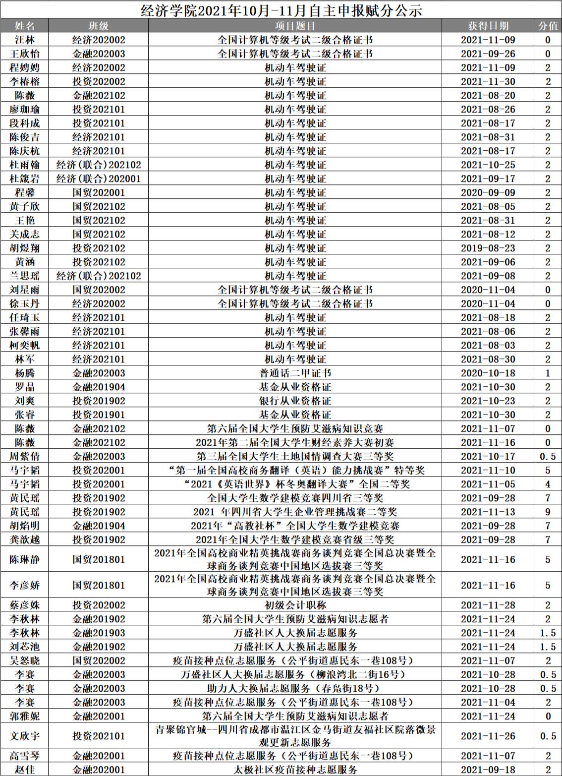 经学院团委二课运营中心收集自主申报材料,各相应职能部门审核,现将2021年10月-11月自主申报赋分情况公示如下: