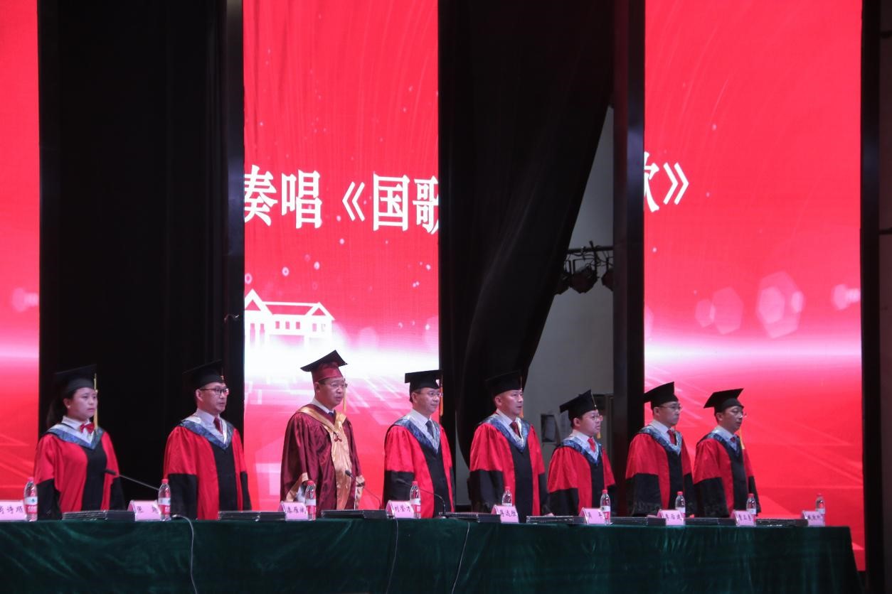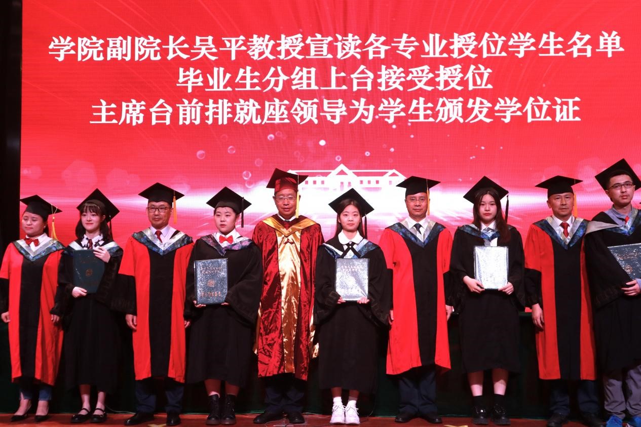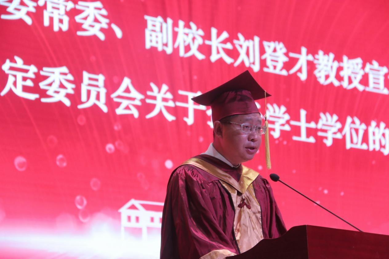 刘登才副校长宣读学位评定委员会关于授予学士学位的决议后,主席台就座的领导和老师为490名毕业生授位并颁发学位证。