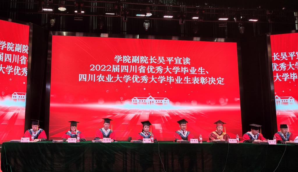 吴平宣读2022届四川省优秀大学毕业生、学校优秀大学毕业生、学校优秀毕业论文和学院优秀毕业论文获奖名单,主席台就座的领导和老师为获奖代表者颁奖。