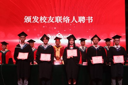 为凝聚校友力量,不断推进母校与校友共同发展,学院于本届毕业学生中,特聘了五位校友联络人,并由主席台就座的领导和老师为他们颁发校友联络人聘书。