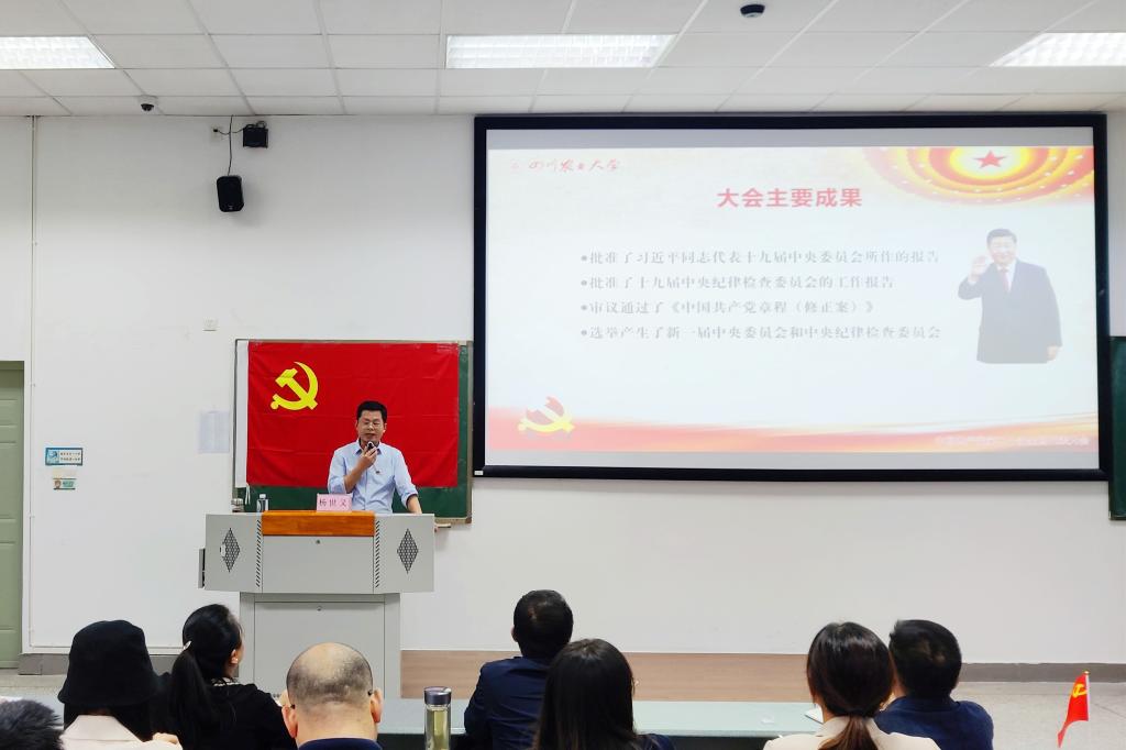 11月1日下午,党的二十大精神专题学习辅导报告会在4A306教室召开,报告会邀请到四川省委宣讲团成员、我校马克思主义学院党委书记杨世义做专题辅导,学院在家党委委员、纪委委员,党群行政党支部、区域经济与金融研究所党支部、经济学教工党支部、金融学教工党支部、国贸教工党支部五个党支部的教职工党员,学院2022年下半年入党积极分子培训班全体学员,共200余名师生党员、入党积极分子聆听了专题报告。永利官网致公党党员康明惠博士列席报告会。