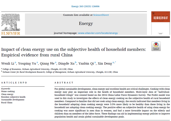 经济学专业2019级本科生李文丽为第一作者,题为“Impact of clean energy use on the subjective health of household members: Empirical evidence from rural China”的研究论文发表于国际权威期刊《Energy》(中科院TOP期刊,IF = 8.857,JCR排名3/63),该文探讨了健康行为的驱动机制。清洁能源和人类健康对于全球可持续发展至关重要。基于全国大尺度调查数据,构建“个体-家庭-村庄”多层次数据集,研究了清洁能源使用对农村居民主观健康的影响。研究表明与不使用清洁能源做饭的家庭相比,生活在使用清洁能源做饭家庭中的成员主观健康表现更好。特别是清洁能源使用能够改善农村家庭中老人和儿童的主观健康。