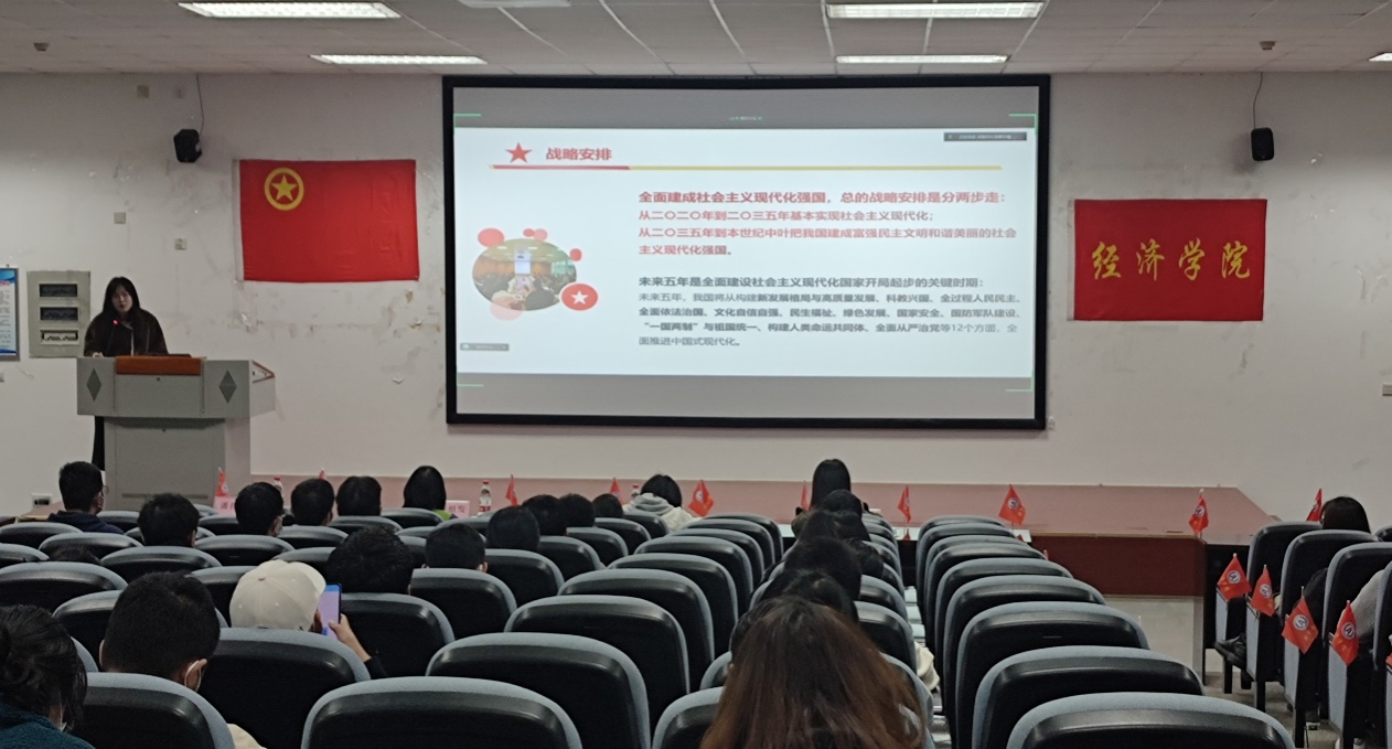 传承建党精神,赓续红色血脉。会议伊始,与会团员齐唱团歌、进行青年大学习,观看“党的二十大”专题学习视频。由研究生理论宣讲团成员、马克思主义学院2022级思想政治教育研究生潘佳佳进行“不负青春誓言,书写奋进篇章”主题宣讲,为团员介绍伟大建党精神、中国式现代化以及新时代新征程党的使命和任务等内容,号召同学们积极学习党的二十大精神、传承红色血脉 、厚植理想信念,成为有理想、敢担当、能吃苦、肯奋斗的新时代好青年。