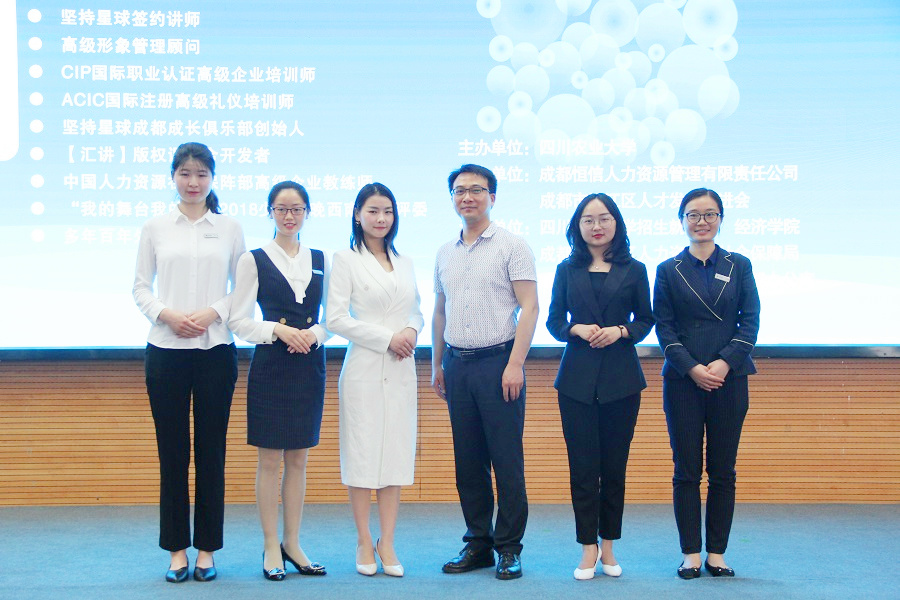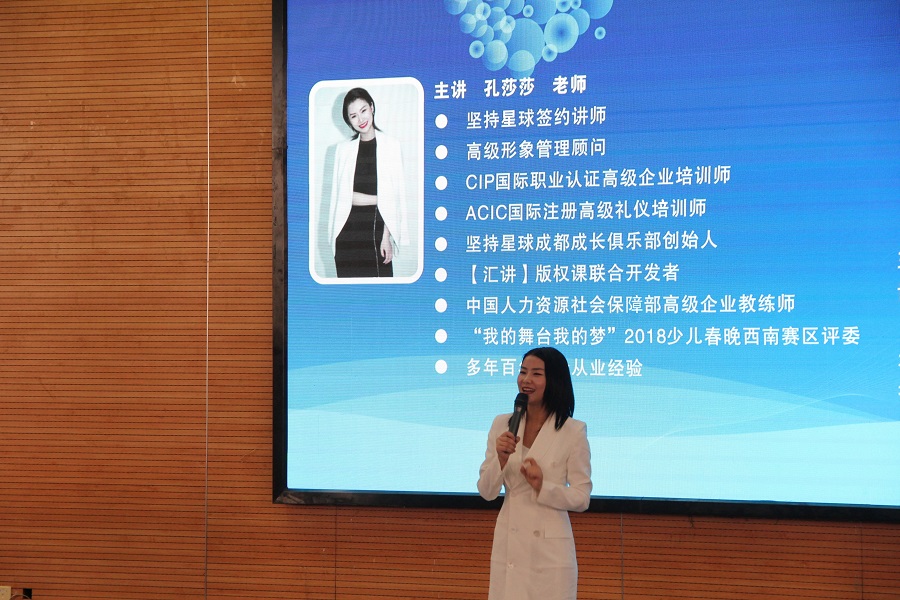 主讲教师是高级形象管理顾问、ACIC国际注册高级礼仪培训师孔莎莎。此次培训得到了成都恒信人力资源管理有限责任公司、成都市温江区人才发展促进会的大力支持。恒信人力公司董事长周成建率公司管理团队参加培训,并在培训开始前播放了温江区人才招聘宣传片,讲解了温江区人才招聘政策。
