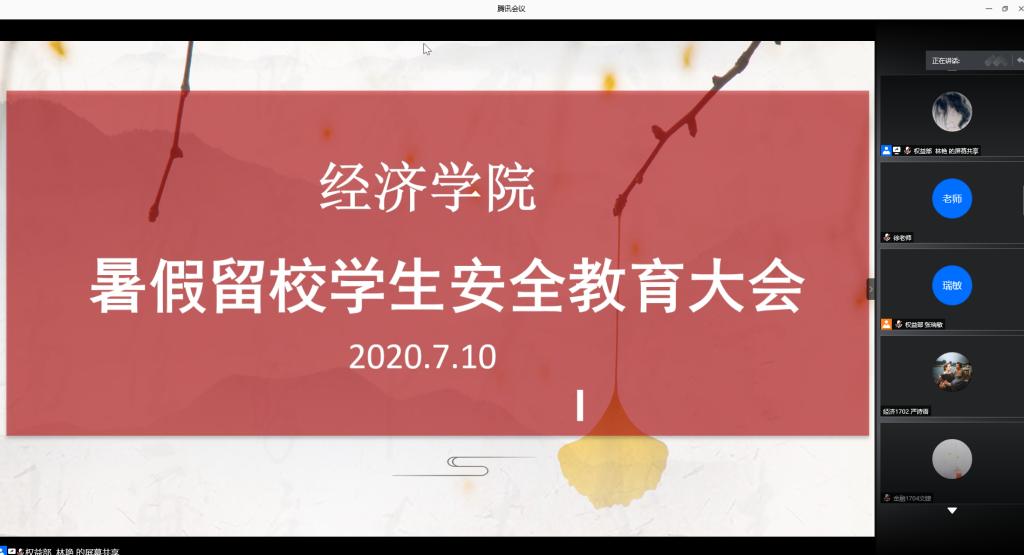 7月10日,为帮助暑假留校同学了解留校管理安排,切实落实学校防疫防控管理要求,永利集团88304官网在线登录面向学院全体2020年暑假留校学生召开了线上暑假留校安全教育大会。学院辅导员老师以及学生会权益部就暑假留校安全问题及留校管理工作对暑假留校学生开展了专题教育。
