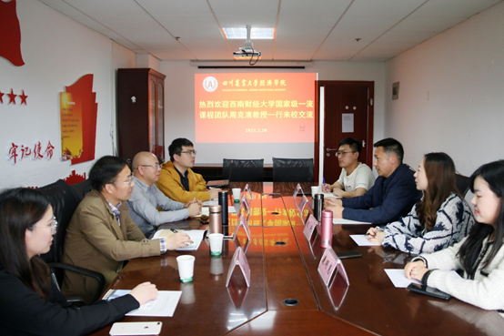 3月30日,西南财经大学财税学院国家级一流课程团队负责人周克清教授一行应邀来我校交流,双方就一流课程建设、课程思政等专题进行深入探讨。永利集团88304官网在线登录吴平副院长,金融学系专业主任刘艳副教授,以及财政与税收课程团队成员参加会议。