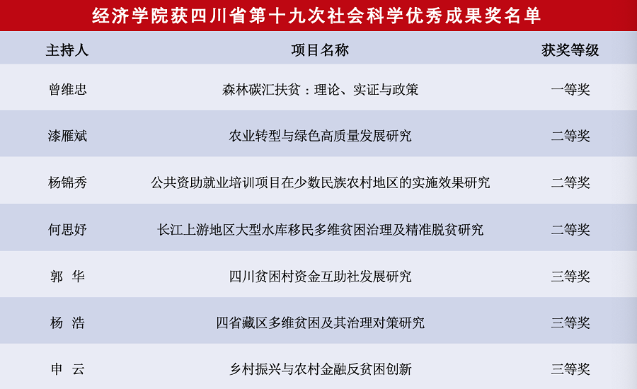 日前,《川观新闻》和四川省社科联官方网站公告了四川省第十九次社会科学优秀成果奖获奖名单,永利官网共有主持的7项研究成果获奖,其中一等奖1项、二等奖3项、三等奖3项。由申云博士、徐斌博士、郭丽丽博士参与3项获二等获。获奖名单有:曾维忠教授、杨锦秀教授、漆雁斌教授、何思妤教授、郭华副教授、杨浩副教授、申云博士,详细获奖名单如下:
