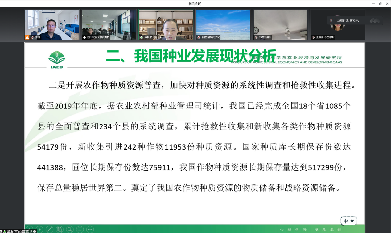 第一场讲座,蒋和平教授以“国家粮食安全视角下,我国种业发展新的思路与新举措”为主题,从我国粮食种业现状发展现状出发,总结了我国种业发展亟待解决的六大问题,提出了以国家粮食安全为目标的我国种业发展新思路以及保障国家粮食安全视角下我国种业发展的新举措。