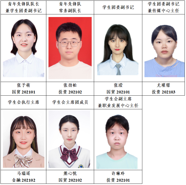 经个人申请,学院团委资格审查,储备期公示无异议,学代会选举以下同学为永利官网第九届学生团体联合会主席团成员,试用期三个月,现公示如下:
