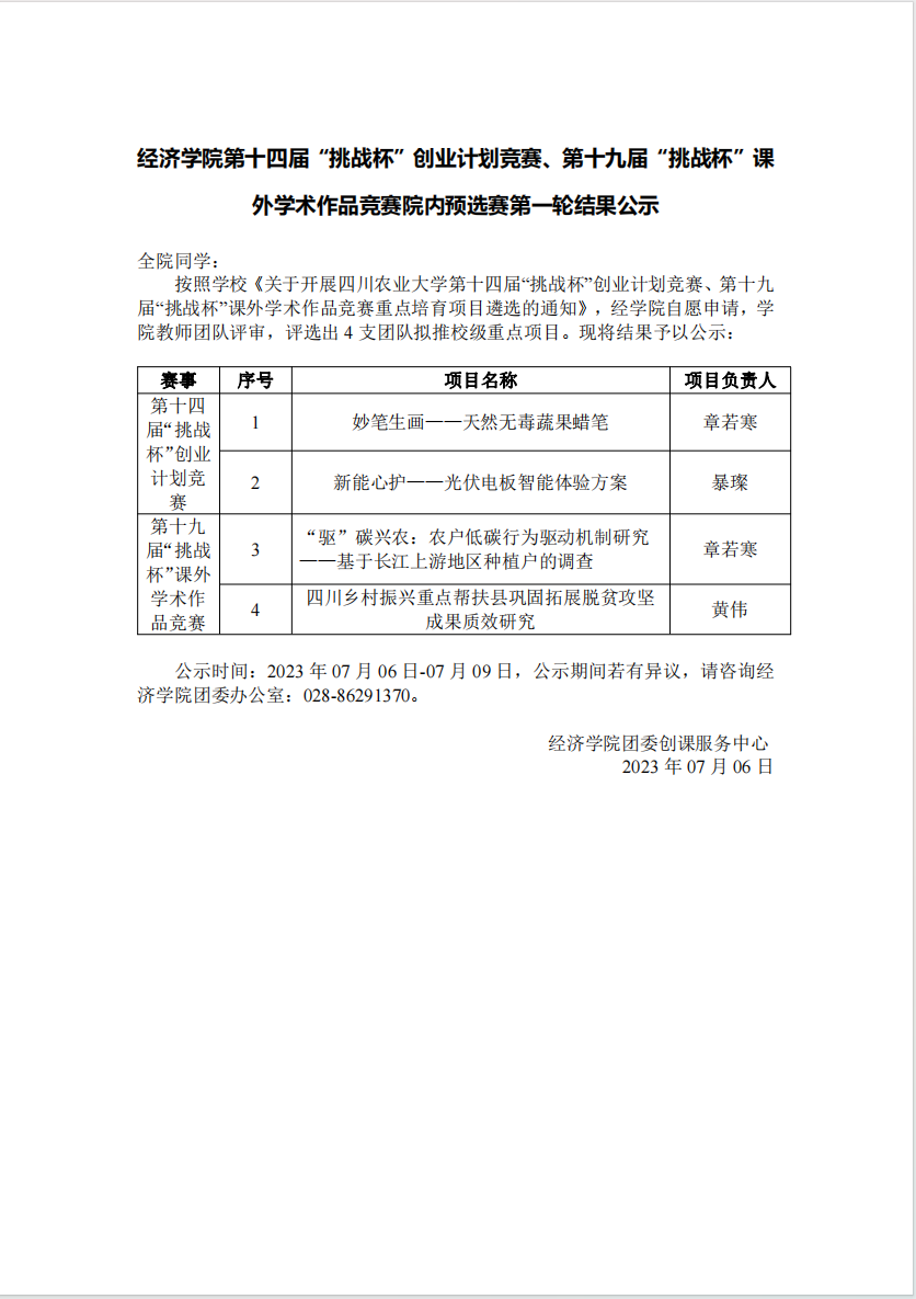 永利集团88304官网在线登录第十四届“挑战杯”创业计划竞赛、第十九届“挑战杯”课外学术作品竞赛院内预选赛第一轮结果公示