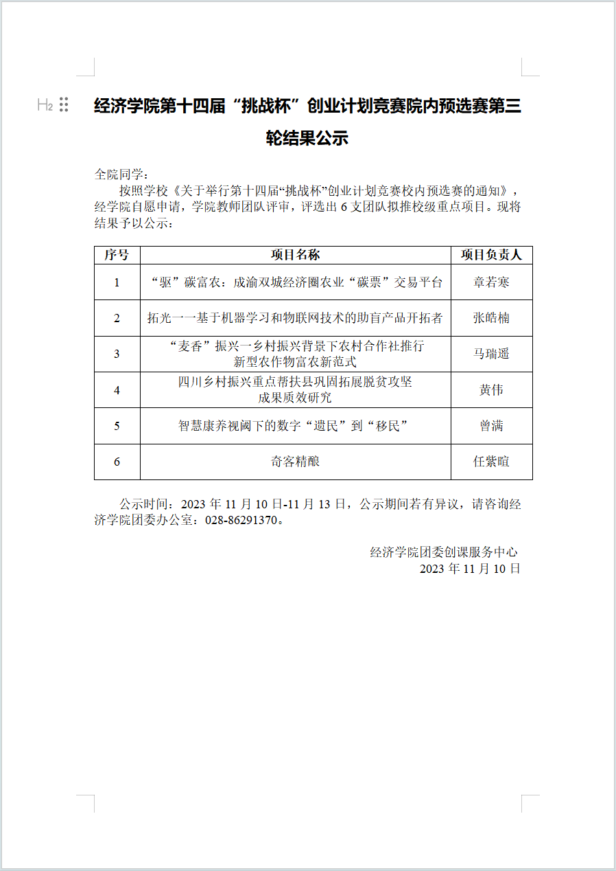 永利集团88304官网在线登录第十四届“挑战杯”创业计划竞赛院内预选赛第三轮结果公示