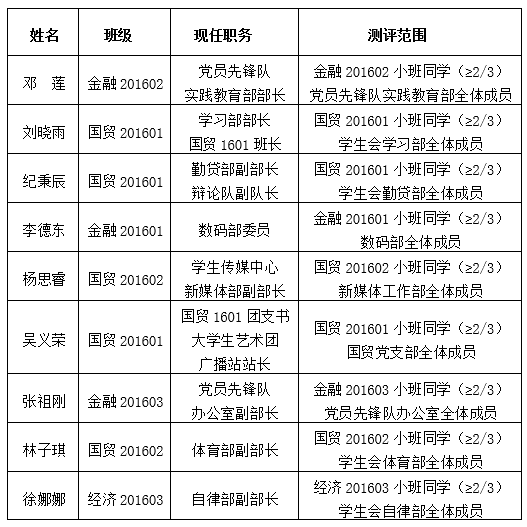 根据《永利集团88304官网在线登录关于加强学生干部队伍建设的实施办法》(院团字[2016]11号),经本人申请、资格审查和面试答辩程序,学院将对邓莲等9名答辩人员进行民主测评,现公告如下: