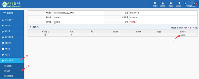 学生通过学生处网站导航栏登录“学生管理工作系统”→A.点击学工队伍建设→B.点击班主任考核→C.点击打分→完成评价。