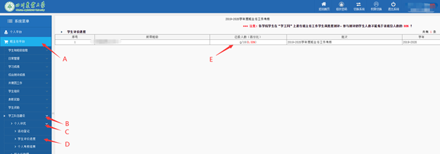 班主任通过学生处主页登录“学生管理工作系统”→A.班主任平台→B. 学工队伍建设→C.个人评优→D.学生评价进度→E.已投人数→查看未参与打分同学→提醒小班同学完成打分。