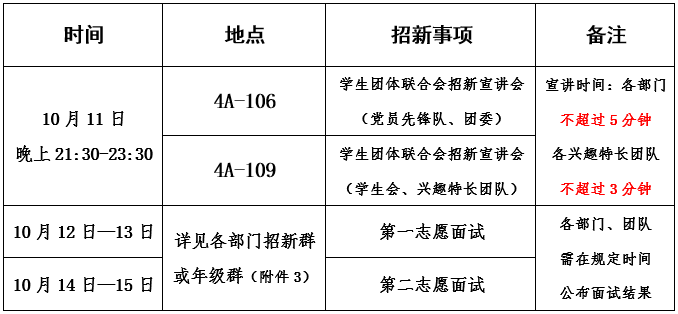 3.由于兴趣特长团队面试方式的特殊性,可能受场地限制,故兴趣特长团队的面试时间、地点请自行组织,有意愿参加的同学请关注相关团队招新群。