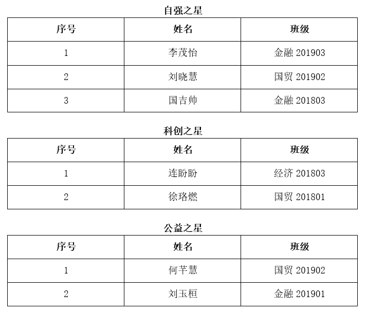 为进一步深化家庭经济困难学生资助育人体系,树立先进典型,激励家庭经济困难学生不畏清寒、励志进取、感恩奉献、逆境成才,学院于11月19日通知评选相关事宜。经学生自愿申请,学院组织评审,现将2021年寒梅飘香工程“自强之星”“公益之星”“科创之星”评选结果公示如下: